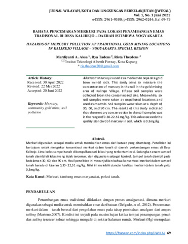 Mardiyanti, A. Aksa and Rya, Tadeus and Rista, Theedens (2022) Bahaya pencemaran merkuri pada lokasi penambangan emas tradisonal di Desa Kalirejo – Daerah Istimewa Yogyakarta. Jurnal Wilayah, Kota, dan Lingkungan Berkelanjutan (JWIKAL), 1 (1): 6. pp. 69-73. ISSN 2962-0244