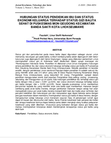 Fauziah, Fauziah and Linur, Steffi Harkensia (2023) Hubungan status pendidikan ibu dan dan status ekonomi keluarga terhadap status gizi balita sehat di Puskesmas Mon Geudong Kecamatan Banda Sakti Kota Lhokseumawe. Jurnal Kesehatan, Teknologi, dan Sains, 2 (1): 5. pp. 36-44. ISSN 2964-4054