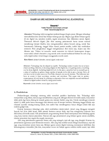 Siswanto, Siswanto (2021) Dakwah bil medsos min manual ila digital. An-Nashiha: Journal of Broadcasting and Islamic Comunication Studies, 1 (2): 1. pp. 54-61. ISSN 2808-4020