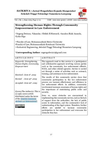 Sugeng, Dwiono and Iskandar, Iskandar and Didiek, R Mawardi and Azzahra, Rizki Ananda and Lidia, Olga (2023) Strengthening human rights through community empowerment in law enforcement. SATKRIYA: Jurnal Pengabdian Kepada Masyarakat, 1 (1): 3. pp. 17-21. ISSN 2988-3431