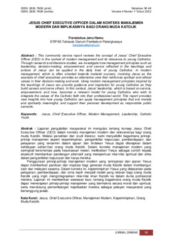 Fransiskus, Janu Hamu (2022) Jesus chief executive officer dalam konteks manajemen modern dan implikasinya bagi orang muda Katolik. Jurnal Dikmas, 4 (1): 3. pp. 36-44. ISSN 2830-7909
