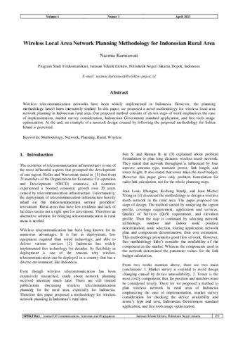 Nazmia, Kurniawati (2023) Wireless local area network planning methodology for Indonesian rural area. SPEKTRAL: Journal of Communications, Antennas and Propagation, 4 (1): 2. pp. 159-165. ISSN 2774-5562