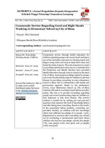 Suryati, Suryati and Nur, Islamiyati (2023) Community service regarding good and right hands washing in Elementary School 25 City of Bima. SATKRIYA: Jurnal Pengabdian Kepada Masyarakat, 1 (1): 6. pp. 38-43. ISSN 2988-3431