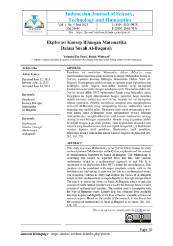Yolanda, Eka Putri and Indah, Wahyuni (2023) Ekplorasi konsep bilangan matematika dalam surah Al-Baqarah. Indonesian Journal of Science, Technology and Humanities, 1 (1): 5. pp. 39-44. ISSN 2988-7976