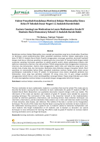 Tri, Mutiara and Safrizal, Safrizal and Yulnetri, Yulnetri (2023) Faktor penyebab rendahnya motivasi belajar matematika siswa kelas IV Sekolah Dasar Negeri 12 Andaleh Baruh Bukit. Jurnal Riset Madrasah Ibtidaiyah, 3 (2): 1. pp. 96-105. ISSN 2807-1034