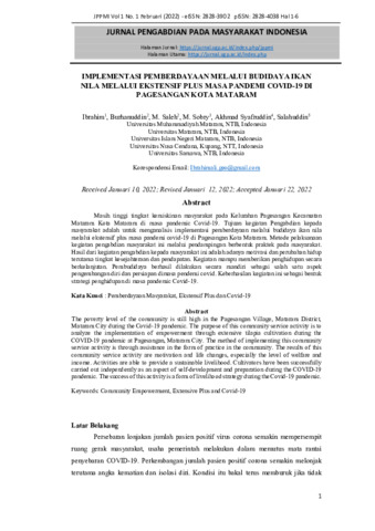 Masih tinggi tingkat kemiskinan masyarakat pada Kelurahan Pagesangan Kecamatan Mataram Kota Mataram di masa pandemic Covid-19. Tujuan kegiatan Pengabdian kepada masyarakat adalah untuk menganalisis implementasi pemberdayaan melalui budidaya ikan nila melalui ekstensif plus masa pandemi covid-19 di Pagesangan Kota Mataram. Metode pelaksanaan kegiatan pengabdian masyarakat ini melalui pendampingan berbentuk praktek pada masyarakat. Hasil dari kegiatan pengabdian kepada masyarakat ini adalah adanya motivasi dan perubahan hidup terutama tingkat kesejahteraan dan pendapatan. Kegiatan mampu memberikan penghidupan secara berkelanjutan. Pembudidaya berhasil dilakukan secara mandiri sebagai salah satu aspek pengembangan diri dan persiapan dimasa pendemi covid. Keberhasilan kegiatan ini sebagai bentuk strategi penghidupan di masa pandemic Covid-19.