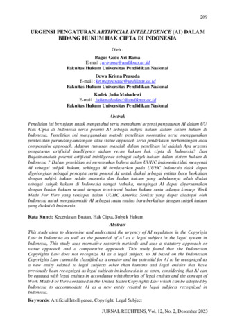 Bagus, Gede Ari Rama and Dewa, Krisna Prasada and Kadek, Julia Mahadewi (2023) Urgensi pengaturan Artificial Intelligence (AI) dalam bidang hukum hak cipta di Indonesia. Jurnal Rechtens, 12 (2): 4. pp. 209-224. ISSN 1907-7114