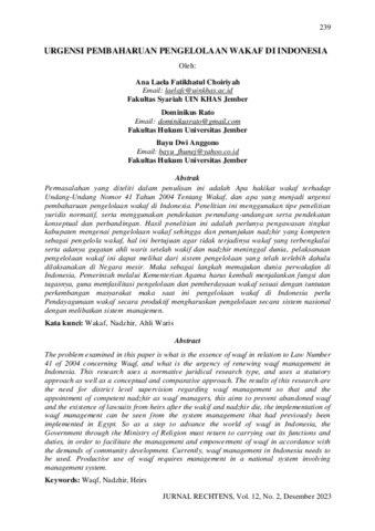 Ana, Laela Fatikhatul Choiriyah and Dominikus, Rato and Bayu, Dwi Anggono (2023) Urgensi pembaharuan pengelolaan wakaf di Indonesia. Jurnal Rechtens, 12 (2): 6. pp. 239-256. ISSN 1907-7114