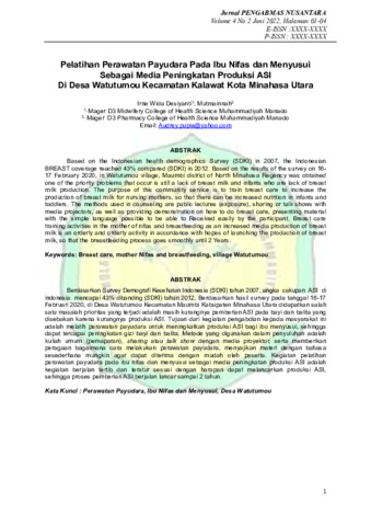 Irne, Wida Desiyanti and Mutmainnah, Mutmainnah (2022) Pelatihan perawatan payudara pada ibu nifas dan menyusui sebagai media peningkatan produksi asi di Desa Watutumou Kecamatan Kalawat Kota Minahasa Utara. Jurnal Pengabdian Masyarakat Nusantara, 4 (2): 1. pp. 1-4. ISSN 2962-1593