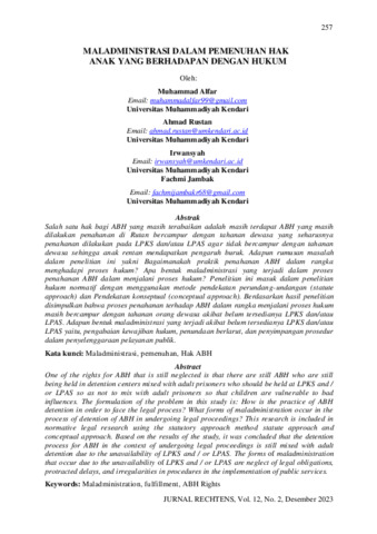 Muhammad, Alfar and Ahmad, Rustan and Irwansyah, Irwansyah and Fachmi, Jambak (2023) Maladministrasi dalam pemenuhan hak anak yang berhadapan dengan hukum. Jurnal Rechtens, 12 (2): 7. pp. 257-272. ISSN 1907-7114