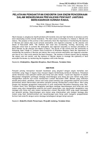 Rizal, Rizal and Muh., Hidayat and Maulana, I. Naki (2022) Pelatihan pengaktifan endorfin dan enzim pencernaan dalam menurunkan prevalensi penyakit jantung berdasarkan sunnah rasul. Jurnal Pengabdian Masyarakat Nusantara, 4 (2): 3. pp. 20-25. ISSN 2962-1593