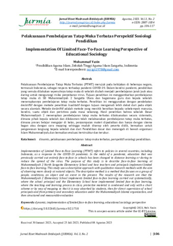 Muhammad, Yasin (2023) Pelaksanaan pembelajaran tatap muka terbatas perspektif sosiologi pendidikan. Jurnal Riset Madrasah Ibtidaiyah, 3 (2): 2. pp. 106-177. ISSN 2807-1034