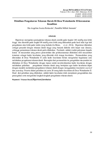 Ria, Angelina Jessica Rotinsulu and Faradilla, Miftah Suranata (2022) Pelatihan pengukuran tekanan darah di Desa Watudambo II Kecamatan Kauditan. Jurnal Pengabdian Masyarakat Nusantara, 4 (2): 4. pp. 26-30. ISSN 2962-1593