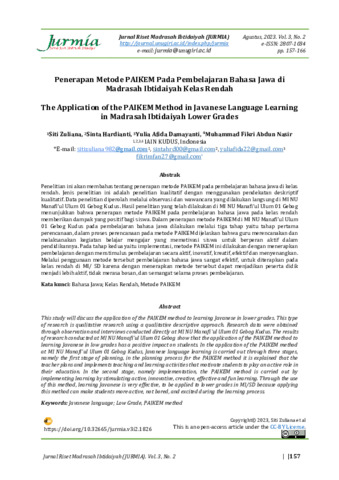 Siti, Zuliana and Sinta, Hardianti and Yulia, Afida Damayanti and Muhammad, Fikri Abdun Nasir (2023) Penerapan metode PAIKEM pada pembelajaran bahasa Jawa di Madrasah Ibtidaiyah kelas rendah. Jurnal Riset Madrasah Ibtidaiyah, 3 (2): 6. pp. 157-166. ISSN 2807-1034