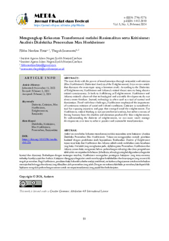 Fildza, Nardina Fitria and Theguh, Saumantri (2024) Mengungkap kekuatan transformasi melalui rasionalitas serta kritisisme: analisis dialektika pencerahan Max Horkheime. Media: Jurnal Filsafat dan Teologi, 5 (1): 5. pp. 81-96. ISSN 2775-0116