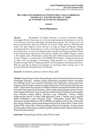 Suwarti, Suwarti and Dyah, Palupiningtyas (2021) Pelatihan pengembangan potensi desa wisata berbasis ekowisata dan pengetahuan guide di Patemon Gunungpati Semarang. Jurnal Pengabdian Masyarakat Waradin, 1 (1): 3. pp. 28-34. ISSN 2774-3349