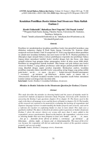 Hendri, Zuliastutik and Rahadiyan, Duwi Nugroho and Eki, Danah Armita (2023) Kesalahan pemilihan bunkei dalam soal shoutesuto mata kuliah Enshuu 2. Ayumi : Jurnal Budaya, Bahasa dan Sastra, 10 (1): 5. pp. 75-100. ISSN 2580-2984