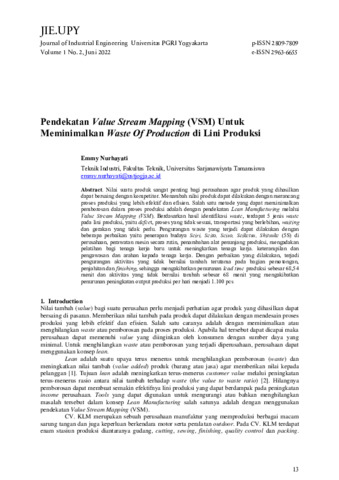 Emmy, Nurhayati (2022) Pendekatan Value Stream Mapping (VSM) untuk meminimalkan waste of production di lini produksi. Journal of Industrial Engineering, 1 (2): 2. pp. 13-18. ISSN 2809-7809
