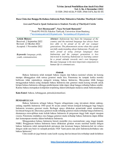 Novi, Rosmayanti and Naya, Novianti Ramanda (2022) Rasa cinta dan bangga berbahasa indonesia pada mahasiswa fakultas Tharbiyah UNISBA. Ta'rim: Jurnal Pendidikan dan Anak Usia Dini, 3 (4): 1. pp. 1-5. ISSN 2964-5476