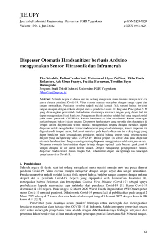 Elsa, Salsabila and Fadian, Candra Sari and Muhammad, Ahyar Zulfikar and Richo, Fenda Refiantoro and Ade, Ulwan Prastyo and Pradika, Hermawan and Theofilus, Bayu Dwinugroho (2022) Dispenser otomatis handsanitizer berbasis arduino menggunakan sensor ultrasonik dan inframerah. Universitas PGRI Yogyakarta, 1 (2): 7. pp. 61-68. ISSN 2809-7809
