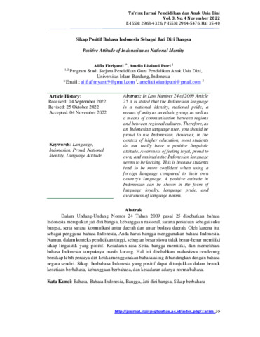 Alifia, Fitriyanti and Amelia, Listianti Putri (2022) Sikap positif Bahasa Indonesia sebagai jati diri bangsa. Ta'rim: Jurnal Pendidikan dan Anak Usia Dini, 3 (4): 6. pp. 35-40. ISSN 2964-5476