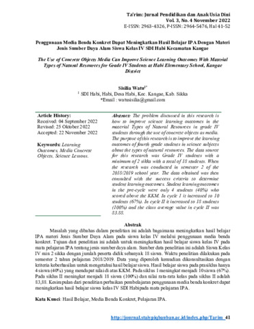 Sisilia, Watu (2022) Penggunaan media benda konkret dapat meningkatkan hasil belajar ipa dengan materi jenis sumber daya alam siswa kelas IV SDI Habi Kecamatan Kangae. Ta'rim: Jurnal Pendidikan dan Anak Usia Dini, 3 (4): 7. pp. 41-52. ISSN 2964-5476