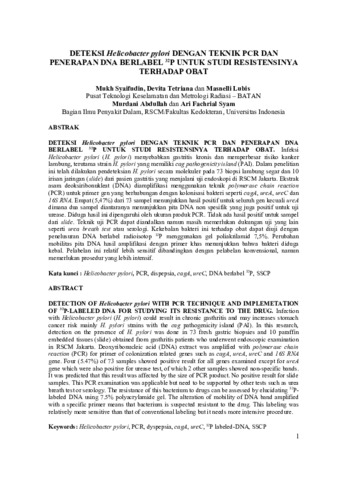 Mukh, Syaifudin and Devita, Tetriana and Masneli, Lubis (2010) DETEKSI Helicobacter pylori DENGAN TEKNIK PCR DAN PENERAPAN DNA BERLABEL 32P UNTUK STUDI RESISTENSINYA TERHADAP OBAT. Nuclear Health Center.