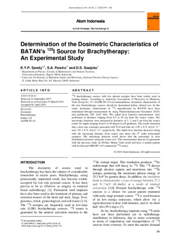 Kriyudi, Pati Sandi and Suproanto, Pawiro and Djarwani, Soejoko (2018) Determination of the Dosimetric Characteristics of BATAN’s 125I Source for Brachytherapy: An Experimental Study. Atom Indonesia, 44 (2). pp. 99-104. ISSN 2356-5322