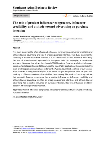 Nadia, Ramadhani and Tanti, Handriana (2023) The role of product-influencer congruence, influencer credibility, and attitude toward advertising on purchase intention. Southeast Asian Business Review, 1 (1): 1. pp. 1-18. ISSN 3025-5171