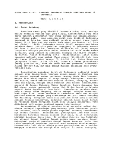 Perairan darat yang dimiliki Indonesia cukup luas, masing masing memiliki variasi tipe yang tinggi, karekteristik yang khas serta tingkat pemanfaatan yang cukup beragam dan pemasalahannya pun khusus pula. Luas perairan darat yang dimiliki Indonesia mencapai 14 juta ha, yang meliputi perairan sungai, rawa, lebak lebung (11,5 juta ha), dan danau, baik alami dan buatan (2,5 juta ha) (Nontji, 1985). Sedangkan Anonim (1985) menyebutkan bahwa perairan darat (tertulis perairan umum;pen.) di Indonesia menca pai luas 17.955.154 ha. Sedangkan Silvius et al. (1986) menge lompokkan wilayah perairan darat kedalam kriteria lahan basah (wetland), yang luasnya di Indonesia mencapai 25.733.200 (Vegeta si Pantai, tidak termasuk; pen.) Klasifikikasi lahan basah tersebut meliputi rawa gambut (Peat swamp) (16.618.000 ha), rawa air tawar (Freshwater swamp) (5.166.500 ha), Hutan Mangrove (Mangrove forest) (3.266.700 ha), Danau Air Tawar (Freshwater lakes) (308.000 ha), Rawa Air Tawar Musiman (Seasonal freshwater swamp) (19.000 ha), dan Rawa Gambut Musiman (Seasonal peat swamp) (355.000 ha).
