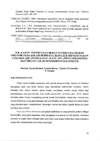 Rosidah, Rosidah and Yayah, Mardiati and Cynthia, Henny and Tjandra, Chrismadha and Tuahta, Tarigan (2015) Kajian penurunaan beban nutrien dan bahan organik pada kolam budidaya ikan lele menggunakan tanaman air (studi kasus : kayu apu (Pistia Stratiotes) dan melati air (Echinodorus Paleafolius). Technical Report. Pusat Penelitian Limnologi, Bogor.