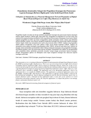Wiralestari, Wiralestari and Enggar, Diah Puspa Arum and Rico, Wijaya and Rita, Friyani (2024) Pemanfaatan akuntansiku sebagai alat pengelolaan keuangan dan penyusunan laporan keuangan berbasis digital pada usaha kedai kopi di Kota Jambi. Abdimas Galuh: Jurnal Pengabdian Kepada Masyarakat, 6 (1): 1. pp. 1-8. ISSN 2716-0211