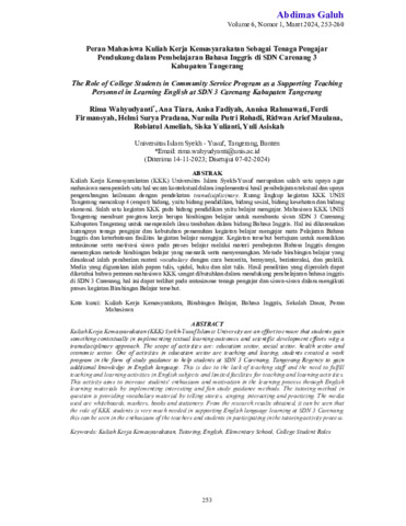 Rima, Wahyudyanti and Ana, Tiara and Anisa, Fadiyah and Annisa, Rahmawati and Ferdi, Firmansyah and Helmi, Surya Pradana and Nurmila, Putri Rohadi and Ridwan, Arief Maulana and Robiatul, Ameliah and Siska, Yulianti and Yuli, Asiskah (2024) Peran mahasiswa kuliah kerja kemasyarakatan sebagai tenaga pengajar pendukung dalam pembelajaran bahasa Inggris di SDN Carenang 3 Kabupaten Tangerang. Abdimas Galuh: Jurnal Pengabdian Kepada Masyarakat, 6 (1): 29. pp. 253-260. ISSN 2716-0211