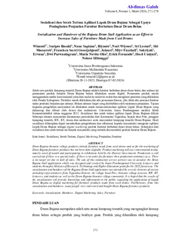 Winanti, Winanti and Sucipto, Basuki and Nana, Supiana and Riyanto, Riyanto and Nuri, Wiyono and Sri, Lestari and Siti, Maesaroh and Francisca, Sestri Goestjahjanti and Jainuri, Jainuri and Miyv, Fayzhall and Sukriyah, Sukriyah and Ervana, Ervana and Dwi, Purwaningrum and Maria, Novita Olin and Erick, Fernando and Hesti, Umiyati and Nelson, Silitongga (2024) Sosialisasi dan serah terima aplikasi lapak drum bujana sebagai upaya peningkatan penjualan furnitur berbahan dasar drum bekas. Abdimas Galuh: Jurnal Pengabdian Kepada Masyarakat, 6 (1): 31. pp. 271-279. ISSN 2716-0211