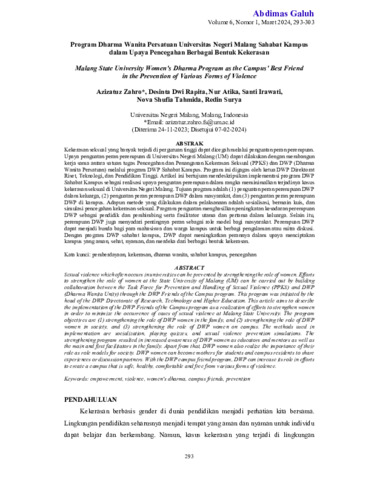 Azizatuz, Zahro and Desinta, Dwi Rapita and Nur, Atika and Santi, Irawati and Nova, Shufia Tahmida and Redin, Surya (2024) Program Dharma Wanita Persatuan Universitas Negeri Malang sahabat kampus dalam upaya pencegahan berbagai bentuk kekerasan. Abdimas Galuh: Jurnal Pengabdian Kepada Masyarakat, 6 (1): 34. pp. 293-303. ISSN 2716-0211