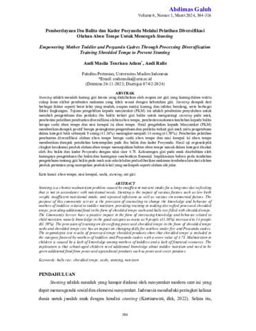 Andi, Maslia Tenrisau Adam and Andi, Ralle (2024) Pemberdayaan ibu balita dan kader Posyandu melalui pelatihan diversifikasi olahan abon tempe untuk mencegah stunting. Abdimas Galuh: Jurnal Pengabdian Kepada Masyarakat, 6 (1): 35. pp. 304-316. ISSN 2716-0211