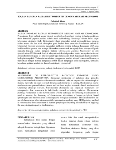 Zubaidah, Alatas (2008) KAJIAN PAPARAN RADIASI RETROSPEKTIF DENGAN ABERASI KROMOSOM. SNKKL IV Tahun 2008, IV. pp. 242-258.