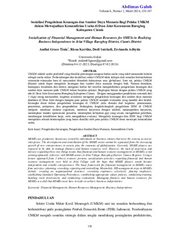 Andini, Grace Tinia and Risna, Kartika and Dodi, Satriadi and Ershanda, Adhytia (2024) Sosialiasi pengelolaan keuangan dan sumber daya manusia bagi pelaku UMKM dalam mewujudkan kemandirian usaha di Desa Jelat Kecamatan Baregbeg Kabupaten Ciamis. Abdimas Galuh: Jurnal Pengabdian Kepada Masyarakat, 6 (1): 38. pp. 326-337. ISSN 2716-0211