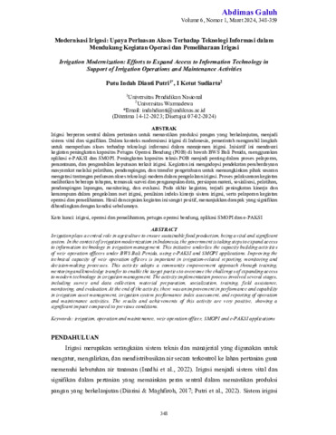 Putu, Indah Dianti Putri and I, Ketut Sudiarta (2024) Modernisasi irigasi: upaya perluasan akses terhadap teknologi informasi dalam mendukung kegiatan operasi dan pemeliharaan irigasi. Abdimas Galuh: Jurnal Pengabdian Kepada Masyarakat, 6 (1): 39. pp. 348-359. ISSN 2716-0211