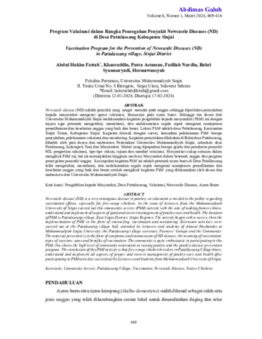 Abdul, Hakim Fattah and Khaeruddin, Khaeruddin and Putra, Astaman and Fadilah, Nurdin and Bahri, Syamsuryadi and Hermawansyah, Hermawansyah (2024) Program vaksinasi dalam rangka pencegahan penyakit Newcastle Diseases (ND) di Desa Pattalassang Kabupaten Sinjai. Abdimas Galuh: Jurnal Pengabdian Kepada Masyarakat, 6 (1): 46. pp. 409-416. ISSN 2716-0211