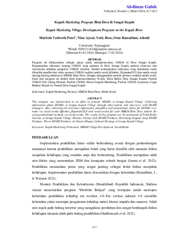 Marbela, Vaderofa Putri and Nina, Ayuni and Yodi, Yodi and Resa, Resa and Iwan, Ramadhan and Afandi, Afandi (2024) Kupah marketing program bina desa di Sungai Kupah. Abdimas Galuh: Jurnal Pengabdian Kepada Masyarakat, 6 (1): 47. pp. 417-425. ISSN 2716-0211