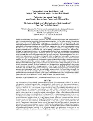 Rio, Andriyat Krisdiawan and Tito, Sugiharto and Ninda, Nura'isyah and Pani, Puja Yanti and Tata, Sutarbi (2024) Pelatihan penggunaan Google Family Link sebagai tools parenting orangtua cerdas di era milenial. Abdimas Galuh: Jurnal Pengabdian Kepada Masyarakat, 6 (1): 49. pp. 435-443. ISSN 2716-0211