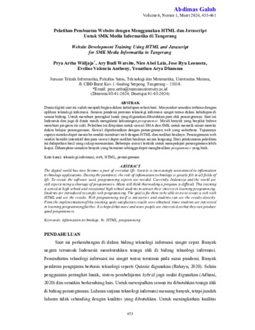 Prya, Artha Widjaja and Ary, Budi Warsito and Nico, Abel Laia and Jose, Ryu Leonesta and Eveline, Valencia Anthony and Yonathan, Arya Dhamma (2024) Pelatihan pembuatan website dengan menggunakan HTML dan Javascript untuk SMK Media Informatika di Tangerang. Abdimas Galuh: Jurnal Pengabdian Kepada Masyarakat, 6 (1): 51. pp. 453-461. ISSN 2716-0211