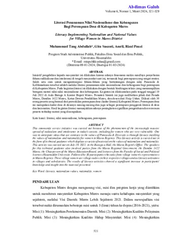 Muhammad, Tang Abdullah and Gita, Susanti and Amril, Amril and Rizal, Pauzi (2024) Literasi penanaman nilai nasionalisme dan kebangsaan bagi perempuan desa di Kabupaten Maros. Abdimas Galuh: Jurnal Pengabdian Kepada Masyarakat, 6 (1): 58. pp. 521-529. ISSN 2716-0211