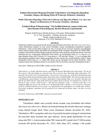 Erindyah, Retno Wikantyasning and Vita, Fadlilah Khairani and Annora, Indrastuti and Anisa, Rachma Priyastiningrum and Destria, Divayana and Izqi, Karimah (2024) Edukasi masyarakat mengenai penyakit tuberkulosis serta dagusibu (dapatkan, gunakan, simpan, dan buang obat) di Wonorejo, Polokarto, Sukoharjo. Abdimas Galuh: Jurnal Pengabdian Kepada Masyarakat, 6 (1): 61. pp. 549-554. ISSN 2716-0211