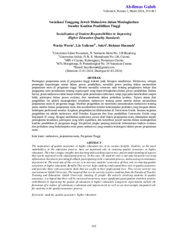 Waska, Warta and Lia, Yulisma and Sukri, Sukri and Rohmat, Hasanah (2024) Sosialisasi tanggung jawab mahasiswa dalam meningkatkan standar kualitas pendidikan tinggi. Abdimas Galuh: Jurnal Pengabdian Kepada Masyarakat, 6 (1): 62. pp. 555-561. ISSN 2716-0211