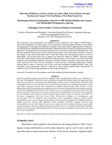 Adaninggar, Septi Subekti and Fransisca, Endang Lestariningsih (2024) Motivation-building to continue studies for junior high school students through training and campus visit facilitating a first-hand experience. Abdimas Galuh: Jurnal Pengabdian Kepada Masyarakat, 6 (1): 63. pp. 562-571. ISSN 2716-0211