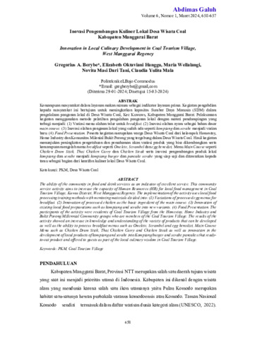 Gregorius, A. Berybe and Elizabeth, Oktaviani Hanggu and Maria, Wellalangi and Novita, Masi Dari Tani and Claudia, Yulita Mala (2024) Inovasi pengembangan kuliner lokal desa wisata coal Kabupaten Manggarai Barat. Abdimas Galuh: Jurnal Pengabdian Kepada Masyarakat, 6 (1): 72. pp. 658-668. ISSN 2716-0211