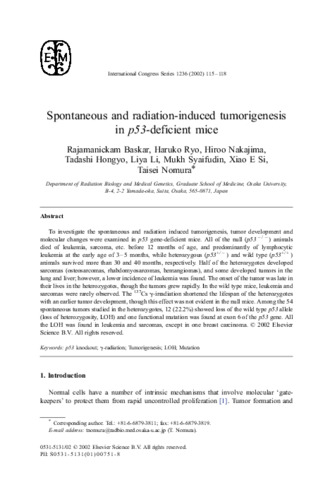 Rajamanikam, Baskar and Mukh, Syaifudin and Taisei, Nomura (2002) Spontaneous and radiation-induced tumorigenesis in p53-deficient mice. International Congress Series, 1236. pp. 115-118.