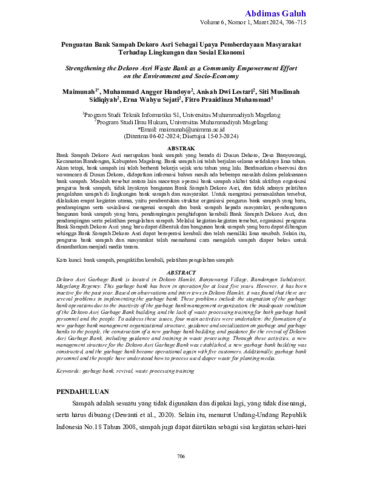 Maimunah, Maimunah and Muhammad, Angger Handoyo and Anisah, Dwi Lestari and Siti, Muslimah Sidiqiyah and Erna, Wahyu Sejati and Fitro, Praaidinza Muhammad (2024) Penguatan Bank Sampah Dekoro Asri sebagai upaya pemberdayaan masyarakat terhadap lingkungan dan sosial ekonomi. Abdimas Galuh: Jurnal Pengabdian Kepada Masyarakat, 6 (1): 77. pp. 706-715. ISSN 2716-0211